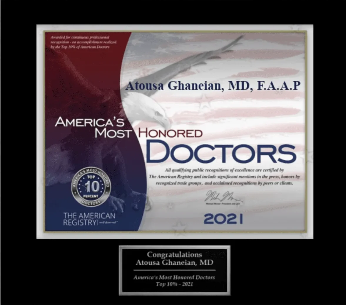 She received the Top Pediatrician Award in 2020 & 2021 from Women in Medicine. She also received the Patient’s Top Choice Award and Most Compassionate Doctor Award, and has been the Vegas, Inc. “Top Doctor in Pediatrics” since 2015. Most recently, Dr. Atousa was honored with the 2021 Reader’s Choice Patient Experience Award.